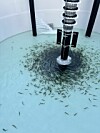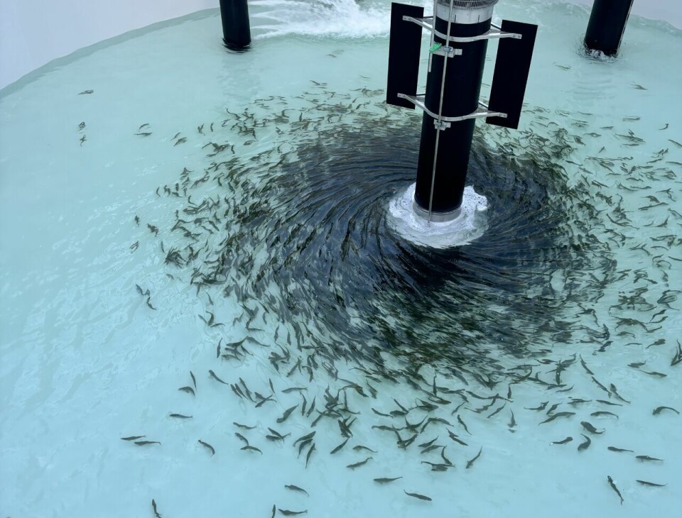 I det nyrestaurerte settefiskanlegget til Eide Smolt i Kvinnherad sym no den fyrste fisken i kara. Anlegget skal bidra til at oppdrettsselskapet vert meir sjølvforsynt med smolt.